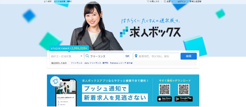 圧倒的な求人数を誇る「求人ボックス」には、フリーランスや副業、正社員など、さまざまな雇用形態の求人が掲載されています。