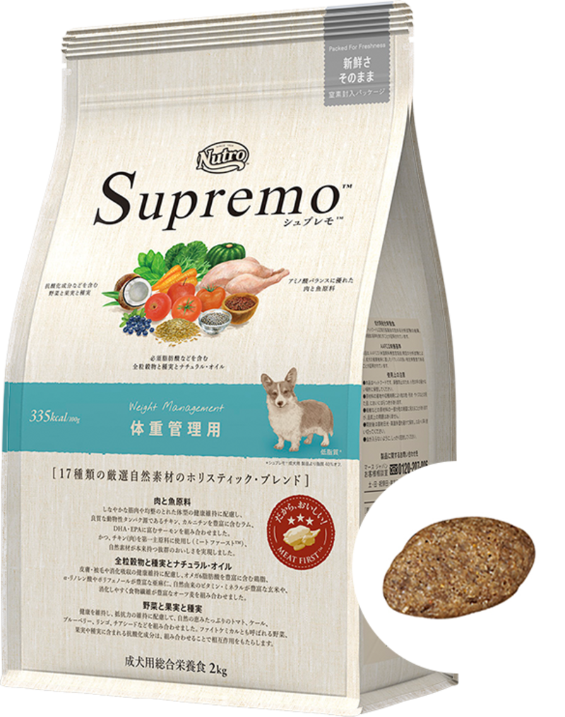 シュプレモ 体重管理用は、脂質を抑えた配合で、肥満傾向にある愛犬の体重管理をサポートするドッグフードです。