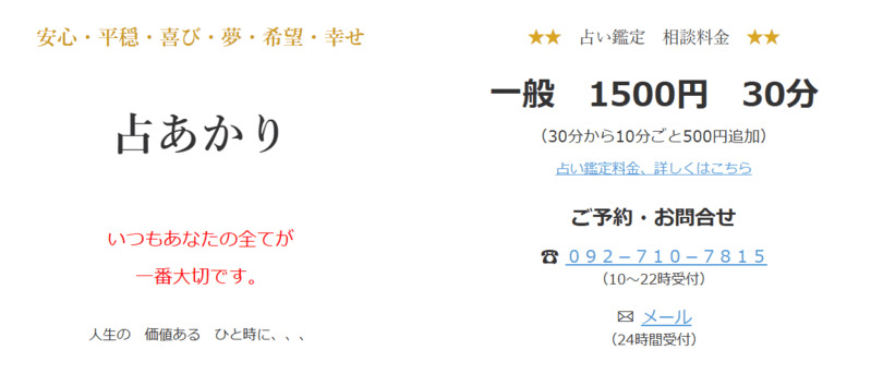 | 鑑定料金 | 対面:60分6,000円 電話:40分5,000円 |