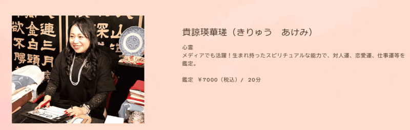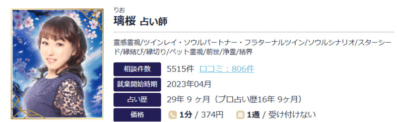 | 得意な相談内容 | 恋愛、家族、子ども、性格、仕事、経営、家、墓、失踪、宗教、職場問題、紛失物 |