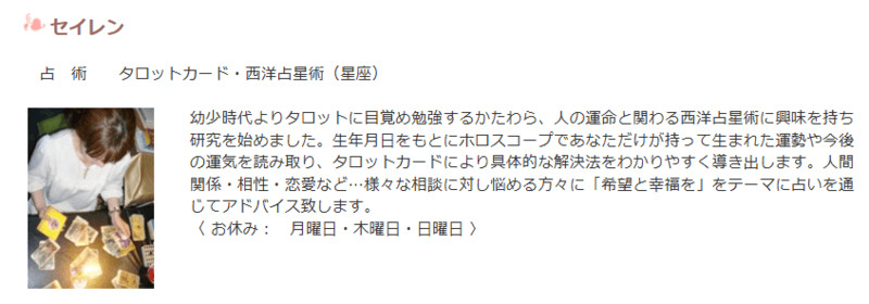 | 占術 | 西洋占星術・霊視・オーラ・タロット |