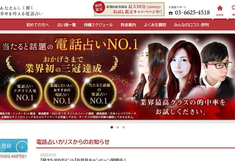「電話占いカリス」は、累計200万件以上の鑑定実績を誇る著名な占いサービスです。