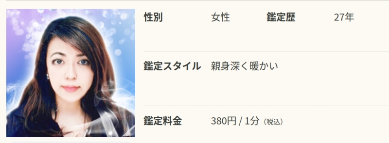 | 得意な相談内容 | 恋愛関係(複雑な恋愛含む)、相手の気持ち、人間関係、霊障など |