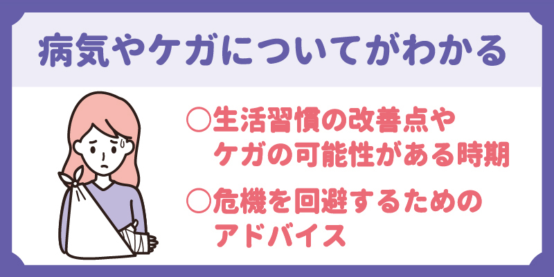 相談者がこの先健康に暮らせるよう、生活習慣の改善点やケガの可能性がある時期を透視し、危機を回避するためのアドバイスをもらえます。
