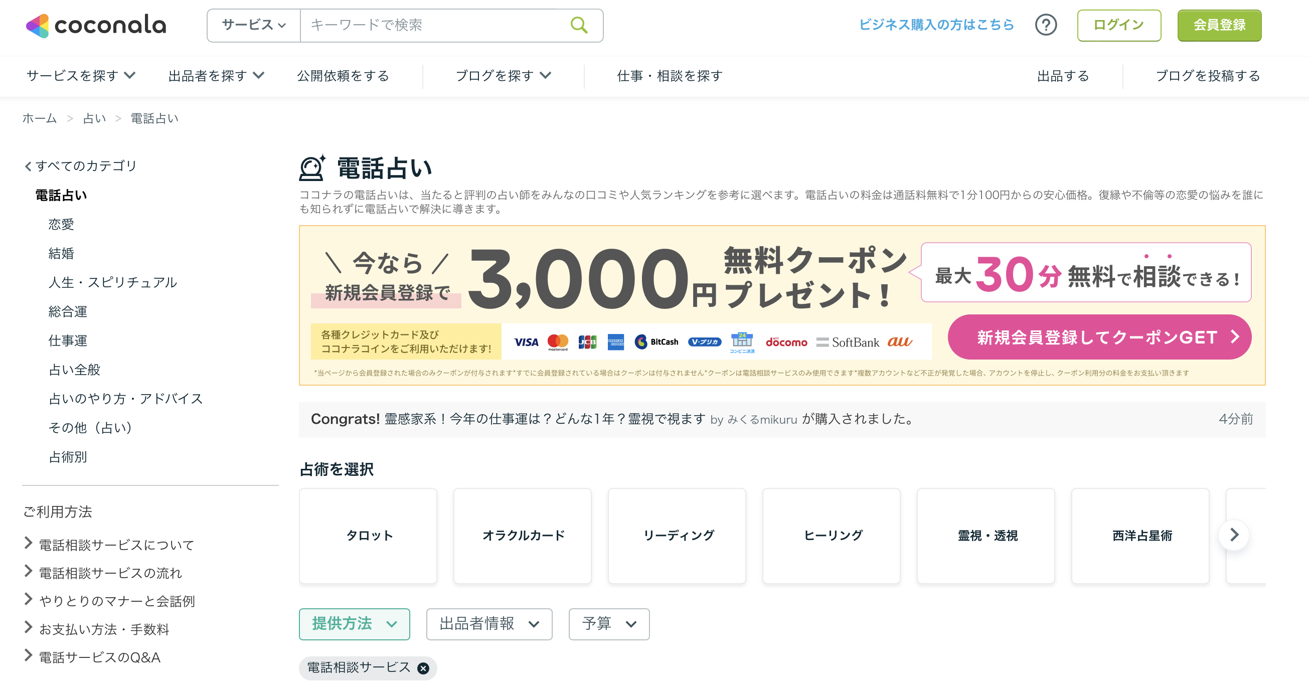 初回特典で最大30分間の鑑定が無料!coconalaを利用しているのであればスムーズに使える