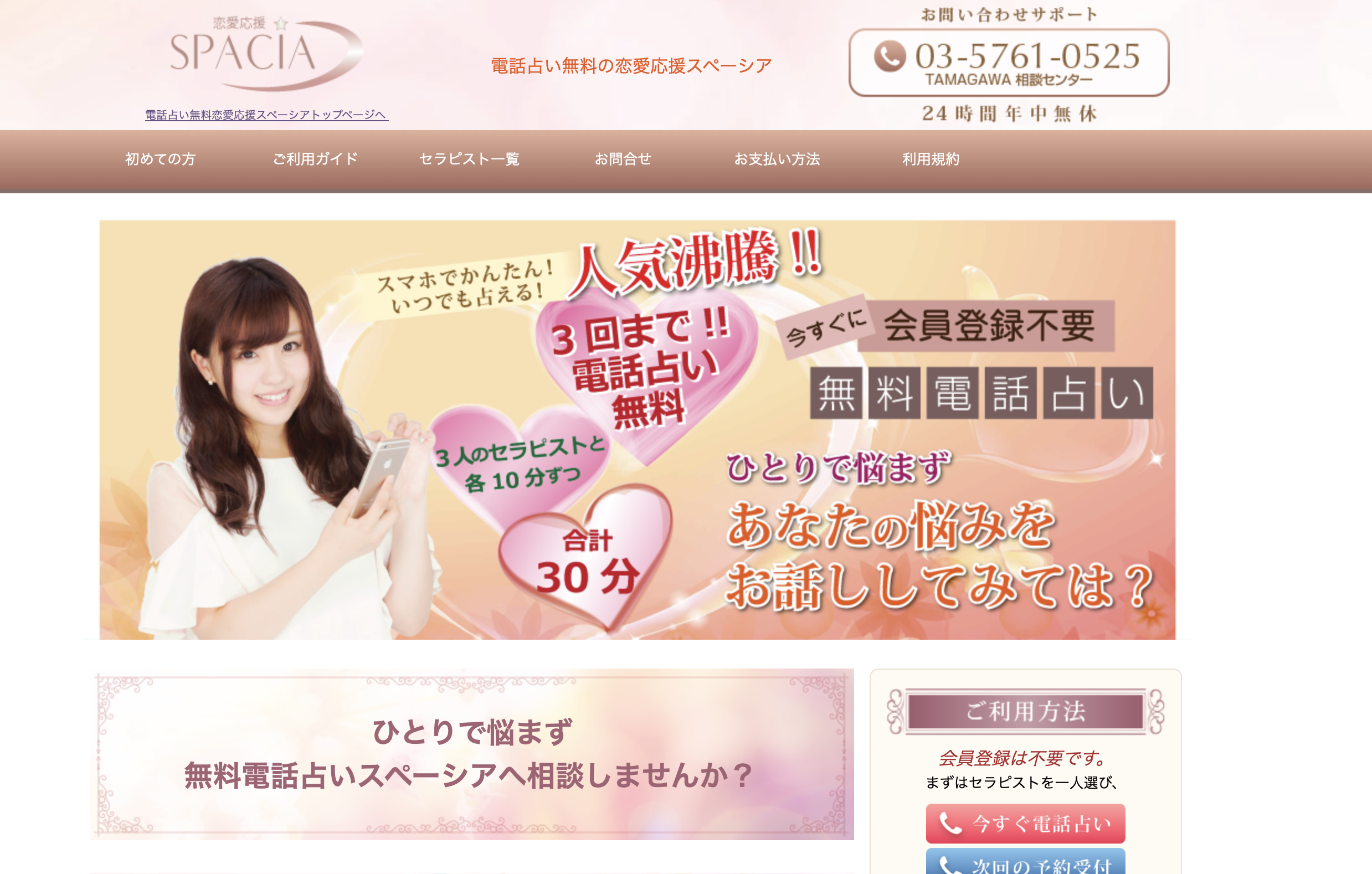 恋愛専門のSPACIAは初回3回分無料で鑑定を受けられるので、電話占いが初めてでお試し感覚での利用を考えている人におすすめ。